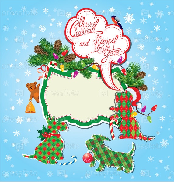 Рождественская открытка - игрушки, ветки пихты и пустая рамка для текста