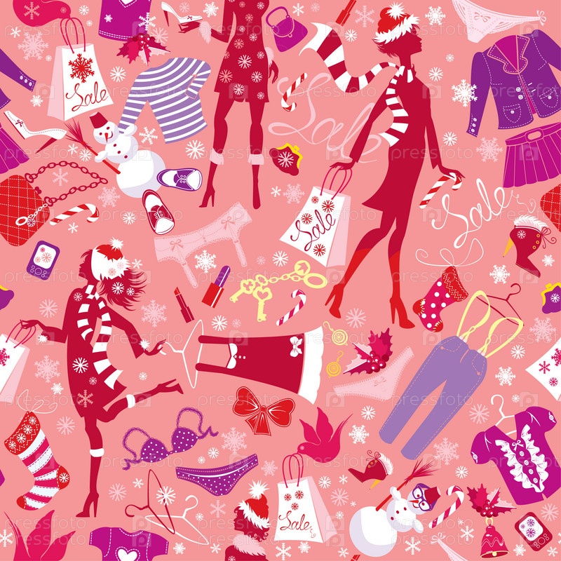Бесшовный фон в розовых тонах - силуэты модных девушек с одеждой