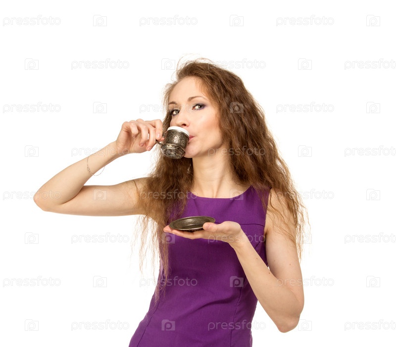 Счастливая девушка держит чашку кофе, изолированная
