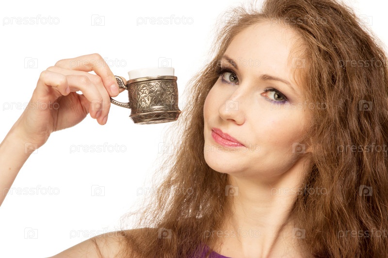 Счастливая девушка держит чашку кофе, изолированная