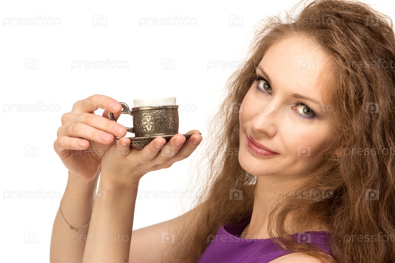 Счастливая девушка держит чашку кофе, изолированная