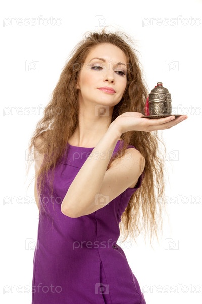 Счастливая девушка держит чашку кофе, изолированная