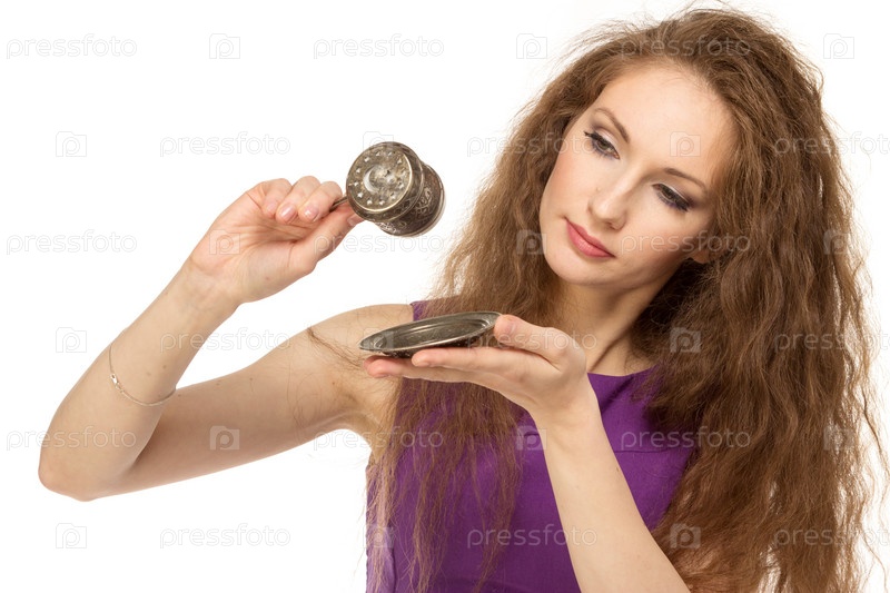 Счастливая девушка держит чашку кофе, изолированная
