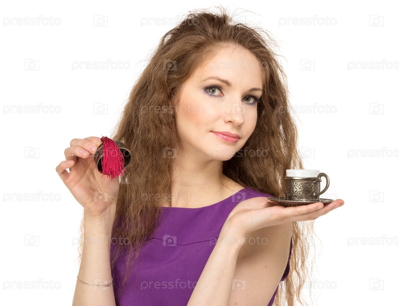 Молодая счастливая женщина держит чашку кофе, изолировано