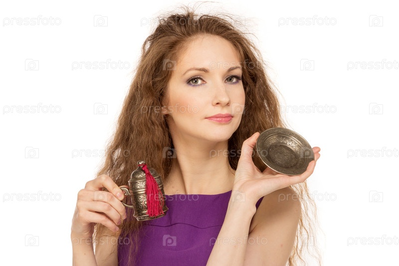 Молодая счастливая женщина держит чашку кофе, изолировано