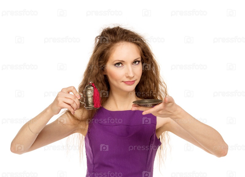 Молодая счастливая женщина держит чашку кофе, изолировано