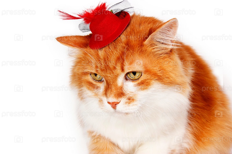 Рыжий кот в красной шляпе с оперением