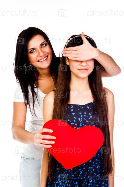 Молодая и красивая мама дарит дочке сердечко