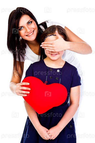 Молодая и красивая мама дарит дочке сердечко