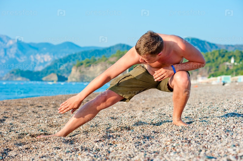 Мужчина занимается спортом на пляже на рассвете