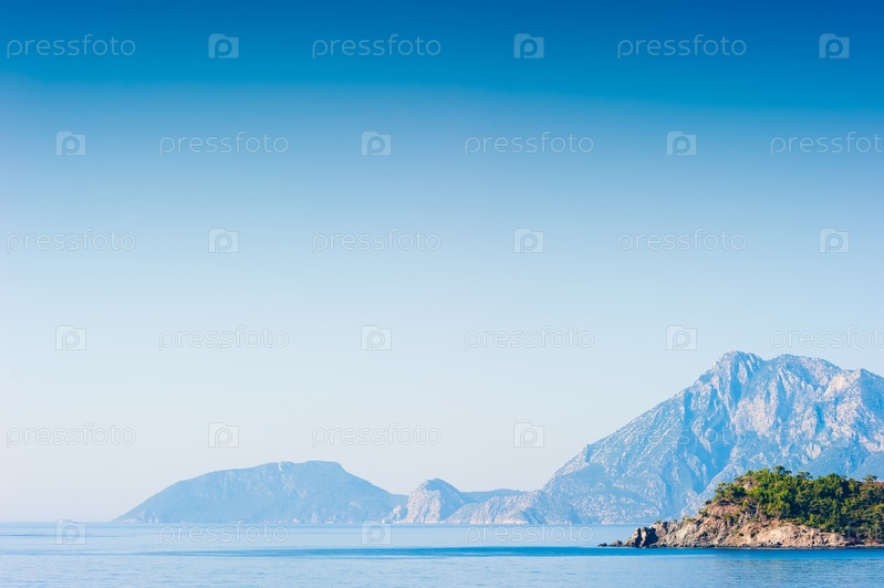 Крутые горы на берегу моря в тумане