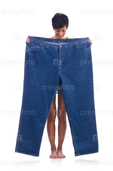 Женщина с большими джинсами в концепции диеты