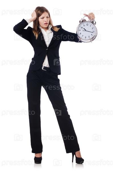 Бизнес-леди с часами, изолированная на белом фоне