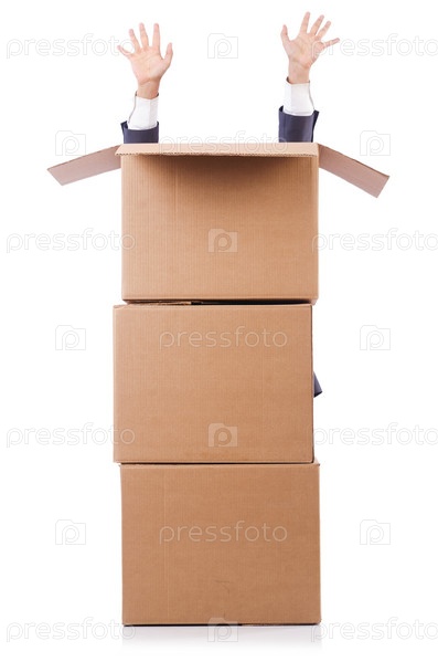 Бизнесмен с коробкой, изолированный на белом