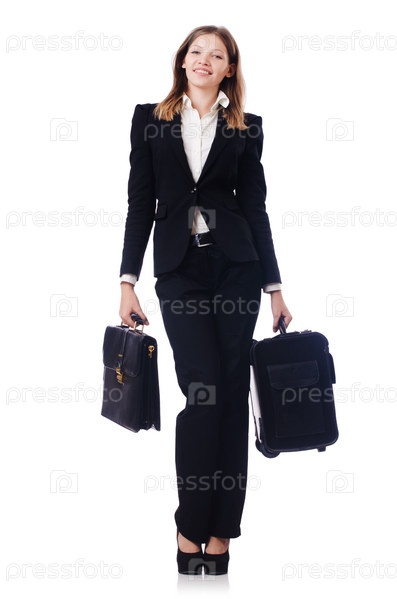 Путешествующая деловая женщина, изолированная на белом