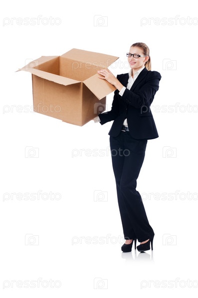 Деловая женщина с коробками на белом фоне