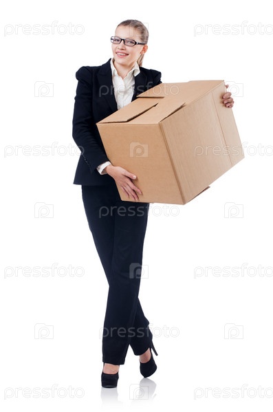 Деловая женщина с коробками на белом фоне
