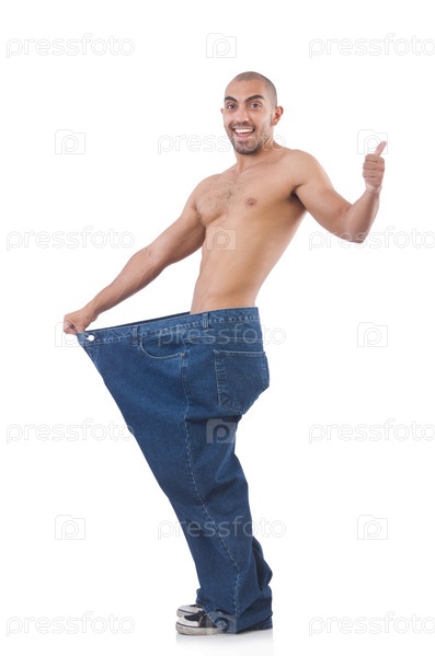 Мужчина в концепции диеты с большими джинсами
