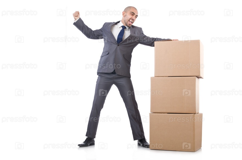 Бизнесмен с коробкой, изолированный на белом фоне