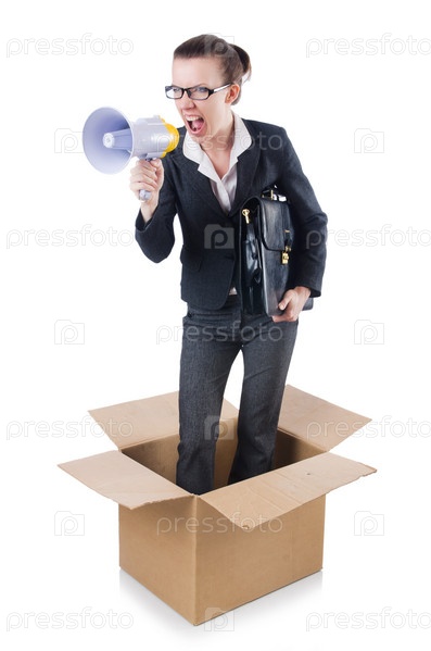 Деловая женщина с громкоговорителем в коробке
