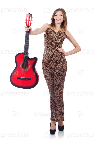 Женщина в леопардовом костюме с гитарой