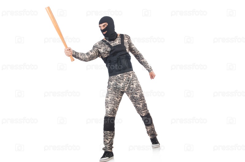 Солдат с бейсбольной битой, изолированный на белом фоне
