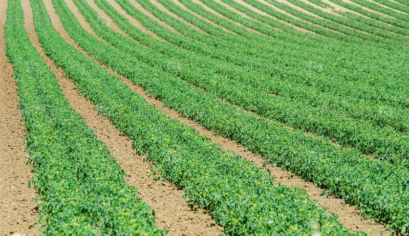 Поле с растущими томатами в яркий летний день