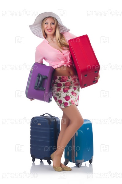 Девушка с чемоданами, изолированная на белом фоне