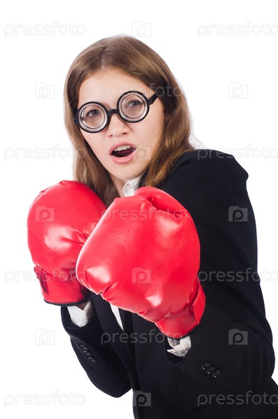 Бизнес-леди с боксерскими перчатками на белом фоне
