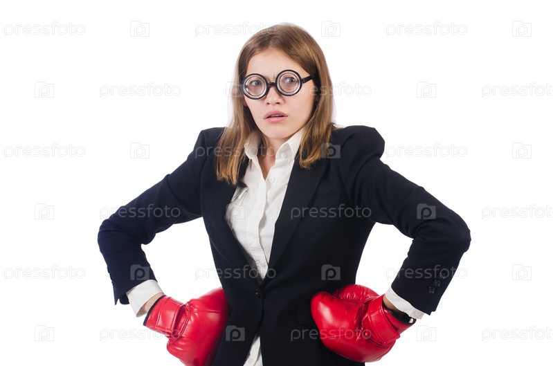Бизнес-леди с боксерскими перчатками на белом фоне