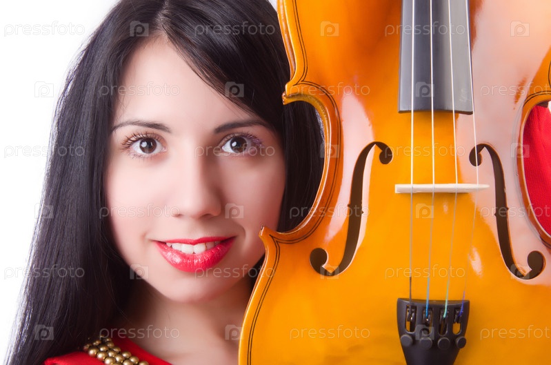 Молодая девушка со скрипкой на белом фоне