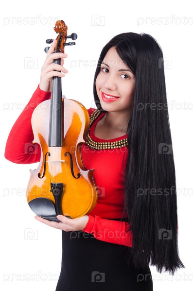 Молодая девушка со скрипкой на белом фоне