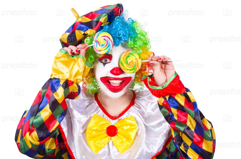 Клоун с леденцами, изолированный на белом фоне