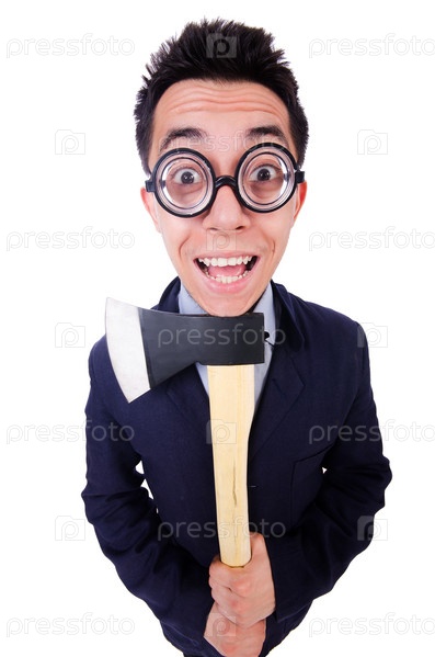 Забавный человек с топором на белом фоне