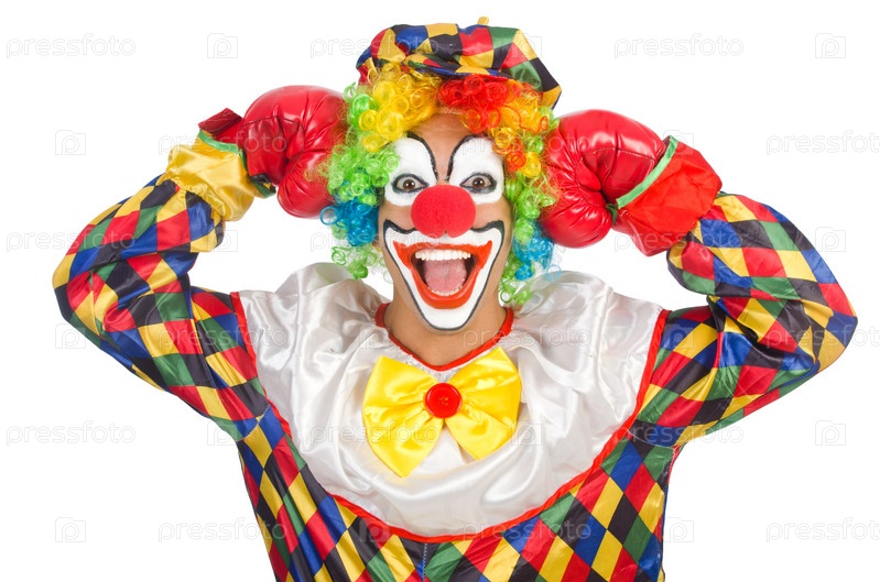 Клоун в боксерских перчатках, изолированный на белом фоне