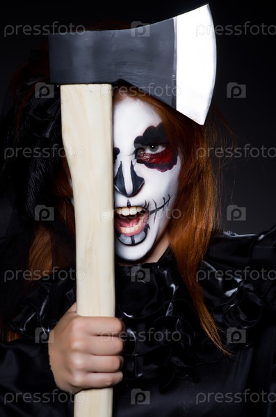 Женщина-монстр с топором в темной комнате