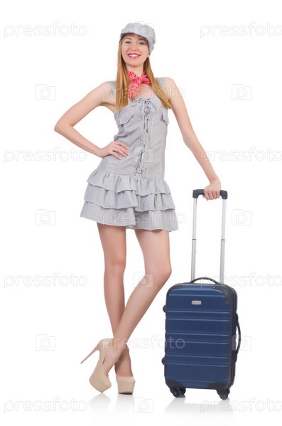 Молодая женщина с чемоданом на белом фоне