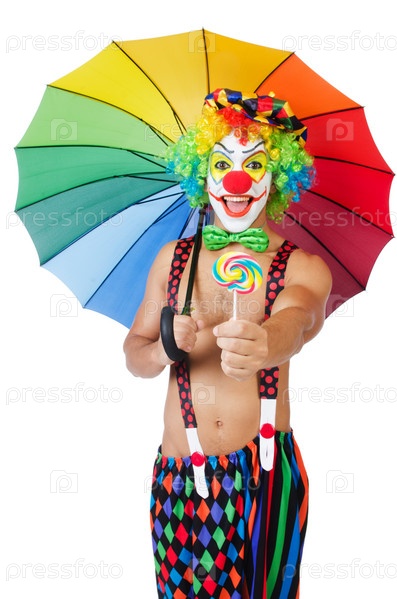 Клоун с зонтиком, изолированный на белом фоне
