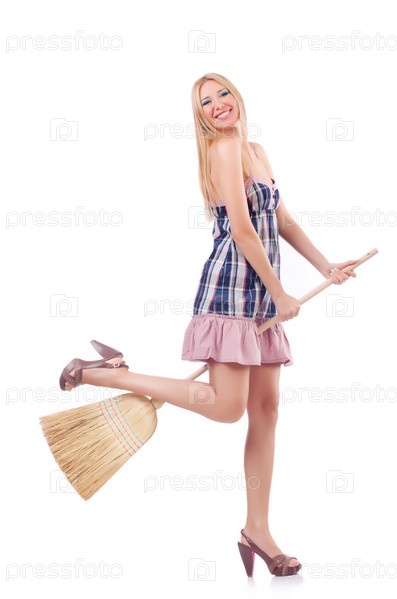 Молодая женщина с веником на белом фоне