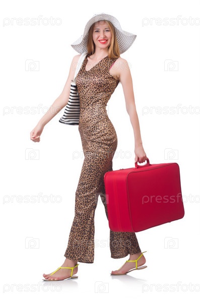 Молодая женщина с чемоданом на белом фоне