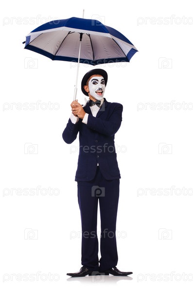 Забавный человек с зонтиком на белом фоне