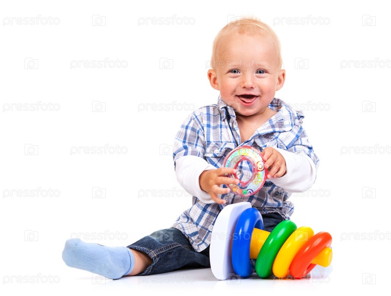 Милый мальчик играет с пирамидой