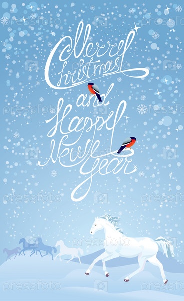 Рождественская и новогодняя открытка с белыми лошадьми и снегирями