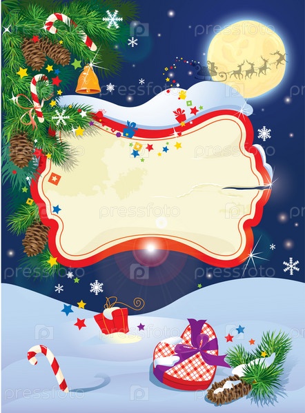 Рождественская и новогодняя открытка с летящими оленями на фоне неба с рамой, еловыми ветвям