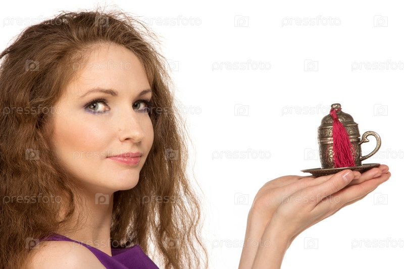 Молодая счастливая женщина с чашкой кофе, изолированная