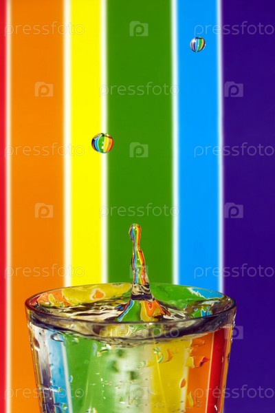 Две капли падают в стакан с водой на полосатом фоне