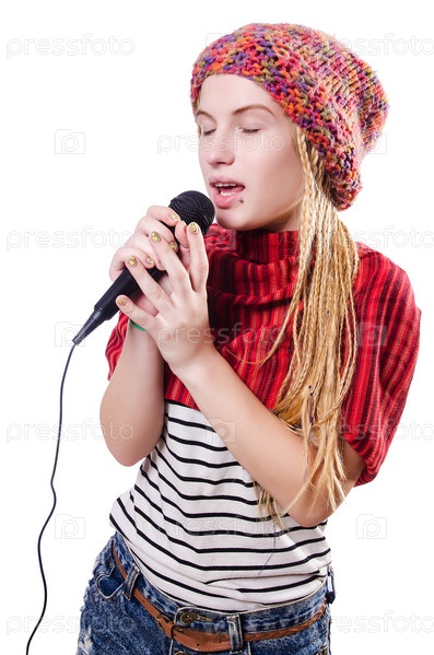 Молодая певица с микрофоном на белом фоне