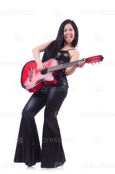 Женщина с гитарой, изолированная на белом