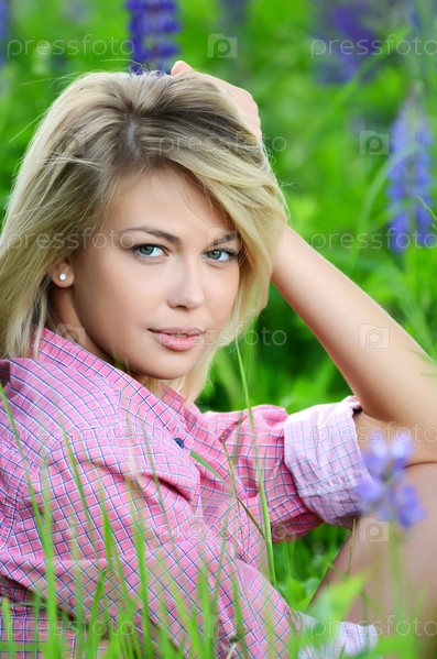 Красивая женщина на поле люпинов