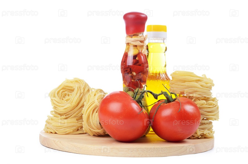Макароны с оливковым маслом и помидорами, изолированные